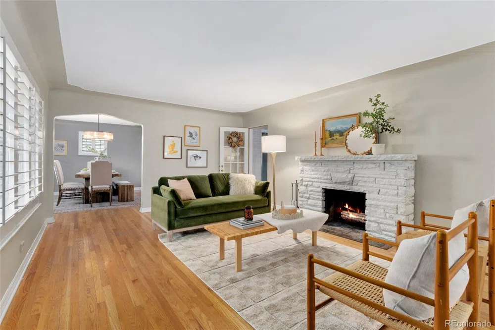 The best value in Mayfair! Welcome to this beautifully finished home in Denver’s desirable Mayfair neighborhood, perfectly positioned on a spacious corner lot! The inviting front porch welcomes you inside, where the living room greets you with a stunning dual-sided wood-burning fireplace, offering a cozy ambiance that extends into the adjacent family room. The family room, sharing the second side of the fireplace, seamlessly connects to the outdoor patio. Plantation shutters throughout the home add a sophisticated touch, elevating the style in every room. The bright and sunny dining room features a charming built-in hutch and leads into the well-appointed kitchen, which boasts granite countertops, stainless steel appliances, and abundant cabinet space. Conveniently located off the kitchen is a half bath, perfect for guests. The main floor is home to three spacious and sun-filled bedrooms, along with a full bath that complements the living space. Venture downstairs to discover the fourth bedroom, which offers great flexibility as a guest suite or an additional primary bedroom with an en-suite bathroom. This home has newer quality windows and plantation shutters for privacy and sound insulation. This home offers exceptional outdoor living areas, including both covered and uncovered patios. The private yard is tucked away behind privacy fencing and beneath a large shade tree, ideal for gatherings or simply relaxing. A stoplight near the home ensures easy access to the driveway and attached garage, making coming and going a breeze. Walkable to multiple grocery stores, including King Soopers, Safeway, and Marczyk's. Located just minutes from some of Denver’s finest dining, and entertainment, this home combines comfort, convenience, and a prime location in one of the city’s most coveted neighborhoods. Don’t miss the opportunity to make this Mayfair gem your own!